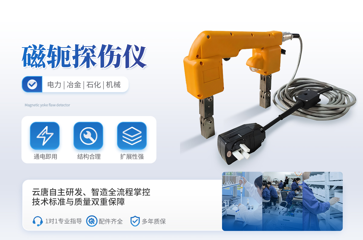 YT-CTS220交流磁軛探傷儀 ,無主機設計,操作簡單方便,噪音小、重量小、適用性強,工作穩定。適用于電力、冶金、石化、機械等行業各類鋼鐵結構件,鍋爐、壓力容器、壓力管道及各類型焊接結構的鐵磁性材料表層及近表層缺陷的磁粉探傷。該探傷儀可以直接連接交流電使用,也可以選配交流磁化電源和直流磁化電源使用,**輕便。特別適用于船體焊縫檢測、高空鋼結構焊縫檢測及壓力容器內部作業。