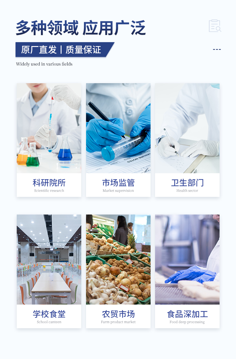 多功能食品安全檢測儀可快速檢測200多項(xiàng)目,包含非食用化學(xué)物質(zhì)、濫用食品添加劑、農(nóng)藥殘留、獸藥殘留、重金屬、病害肉、營養(yǎng)強(qiáng)化劑、抗生素類殘留、激素類殘留、真菌毒素類殘留、化學(xué)類殘留等現(xiàn)場的定性定量檢測。該多功能食品安全檢測儀為集成化食品安全快速檢測分析設(shè)備,廣泛應(yīng)用于市場監(jiān)管局、檢測中心、衛(wèi)生監(jiān)督部門、農(nóng)業(yè)部門、院校及各單位食堂、食品肉產(chǎn)品深加工企業(yè)、商超市場、司法部門、餐飲機(jī)構(gòu)、養(yǎng)殖場、屠宰場、檢驗(yàn)檢疫部門等單位使用。