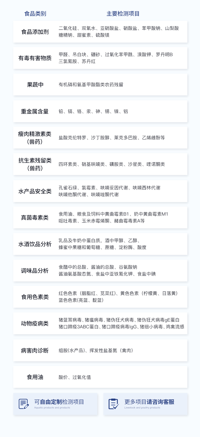 | 食品添加劑:二氧化硫、雙氧水、亞硝酸鹽、硝酸鹽、苯甲酸鈉、山梨酸、糖精鈉、甜蜜素、安賽蜜、硫酸鎂等 | 有毒有害物質(zhì):甲醛、吊白塊、硼砂、過氧化苯甲酰、溴酸鉀、羅丹明B、三聚氰胺、蘇丹紅等 | 農(nóng)藥殘留:酶抑制率法:有機(jī)磷氨基甲酸酯類農(nóng)藥;膠體金法:各種具體農(nóng)藥檢測 | 病害肉診斷:組胺、揮發(fā)性鹽基氮、肉制品酸價、水發(fā)產(chǎn)品中組胺 | 重金屬含量:鉛、鎘、鉻、汞、砷、錫、鎳、鋁等;食用油脂檢測:過氧化值、酸價、油脂丙二醛等。 | 食用油脂檢測:::過氧化值、酸價、油脂丙二醛、總多酚等。 | 瘦肉精激素類(獸藥):鹽酸克倫特羅、沙丁胺醇、萊克多巴胺、己烯雌酚、喹乙醇等 | 抗生素殘留類(獸藥):四環(huán)素類、硝基呋喃類、磺胺類、β-興奮劑類、沙星類、磺胺類、喹諾酮類,甲砜霉素,氟苯尼考,金剛烷胺、替米考星、慶大霉素、林可霉素、鏈霉素、恩諾沙星、環(huán)丙沙星、頭孢啦啶、青霉素、阿莫西林等 | 真菌毒素類:食用油、糧食及飼料中黃曲霉毒素B1、奶中黃曲霉毒素M1、嘔吐毒素、玉米赤霉烯酮、赭曲霉毒素A等 | 水酒飲品分析:乳品及牛奶中蛋白質(zhì);酒中甲醇、乙醇、雜醇油;蜂蜜中果糖和葡萄糖、蔗糖、淀粉酶、酸度;水中氰化物、余氯,飲料中維C等 | 調(diào)味品成分:食醋的總酸、醬油的總酸、芝麻油純度、谷氨酸鈉、醬油氨基酸態(tài)氮、食鹽中亞鐵氰化鉀、食鹽中碘等 | 食用色素類:紅色色素(胭脂紅、莧菜紅、赤蘚紅、誘惑紅)、黃色色素(檸檬黃、日落黃)、藍(lán)色色素(亮藍(lán))等 | 動物疫病類:豬藍(lán)耳病毒、豬瘟病毒、豬偽狂犬病毒、豬偽狂犬病毒gE蛋白、豬口蹄疫3ABC蛋白、豬口蹄疫病毒IgG、豬細(xì)小病毒、雞禽流感等 | 水產(chǎn)品安全類:孔雀石綠、氯霉素、呋喃妥因代謝、呋喃西林代謝、呋喃它酮代謝、呋喃唑酮代謝、氟苯尼考、土霉素、金霉素、甲砜霉素、地西泮等 |