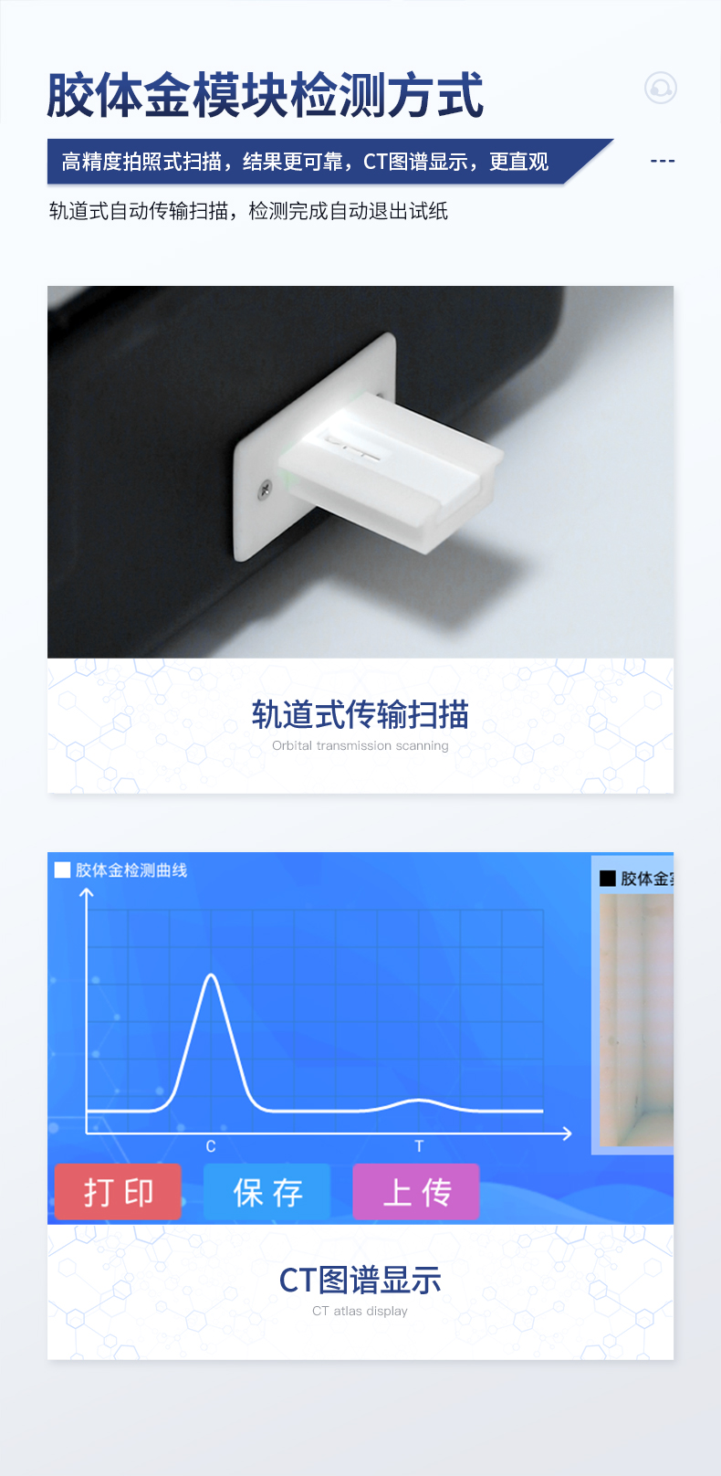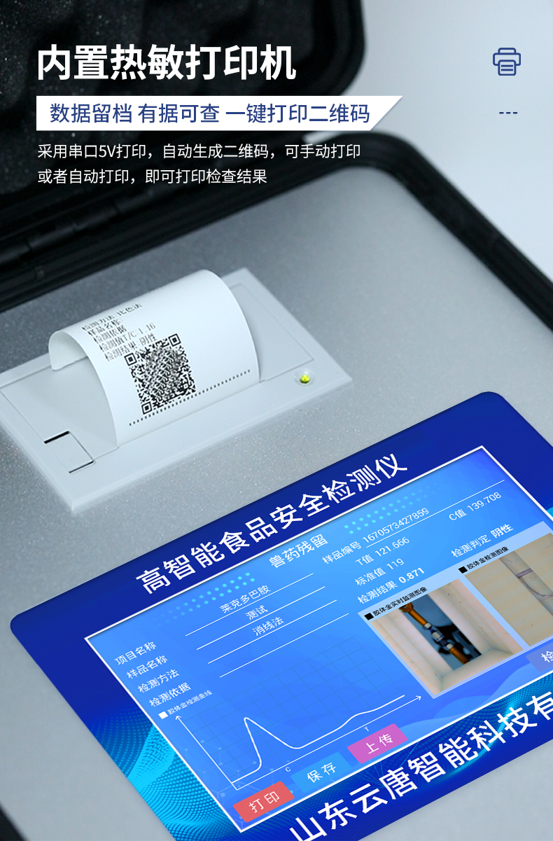 | 安卓智能操作系統(tǒng),采用更加**的UI交互界面,儀器具有wifi聯(lián)網(wǎng)上傳、4G聯(lián)網(wǎng)傳輸、GPRS無線遠(yuǎn)傳、網(wǎng)線連接功能,快速批量上傳數(shù)據(jù)。 | 智能化程度高,儀器具有自檢功能:具有開機(jī)自檢和調(diào)零功能,具有自動檢測重復(fù)性功能。 | 新一代高速熱敏打印機(jī),檢測完成可自動打印或批量打印檢測報告和二維碼。 | ★儀器帶有監(jiān)管平臺,數(shù)據(jù)可局域網(wǎng)和互聯(lián)網(wǎng)數(shù)據(jù)上傳,檢測結(jié)果直接傳至食品安全監(jiān)管平臺。進(jìn)行區(qū)域食品安全監(jiān)管及大數(shù)據(jù)分析處理與數(shù)據(jù)統(tǒng)計,檢測區(qū)域食品安全長短期動態(tài),達(dá)到食品安全問題預(yù)估、預(yù)警 | 一體化主機(jī),包含食品安全檢測模塊、多通道農(nóng)藥殘留檢測模塊、膠體金免疫層析檢測模塊。 | 一體化便攜式快檢設(shè)備,滿足現(xiàn)場及流動檢測使用需求,能夠在同一軟件下實(shí)現(xiàn)所有檢測項(xiàng)目的檢測,并可通過同一窗口直觀顯示檢測結(jié)果。 | 膠體金模塊檢測方式:軌道式自動傳輸掃描,檢測完成后自動退出檢測卡。 | CT線自動識別,無需手動調(diào)整,檢測完成自動顯示CT坐標(biāo)曲線。 | 內(nèi)置強(qiáng)大的數(shù)據(jù)庫,具有多品類多種類樣品菜單功能,可靈活選擇檢測樣品,不同的檢測通道可同時檢測不同的樣品項(xiàng)目。也可在儀器上直接編輯錄入樣品名稱、檢測指標(biāo)、送檢單位等信息并保存進(jìn)樣品數(shù)據(jù)庫。 | 產(chǎn)品內(nèi)置操作演示視頻,是您身邊的化驗(yàn)指導(dǎo)專家。 | 樣品處理簡單省力,整體操作快速、安全、便捷。 | 儀器具有自身保護(hù)功能,可設(shè)置用戶名及密碼,防止非工作人員操作等。 | 高靈敏度,高檢測精度,高重復(fù)性精度,掃描式高精度光學(xué)傳感器。 | 結(jié)果判定線可修改,對照值標(biāo)定值可保存,斷電不丟失數(shù)據(jù)。 | 兼容市場上所有的膠體金卡,使用耗材不受限制,極大增強(qiáng)用戶使用體驗(yàn)。 | 儀器具有重新校準(zhǔn)、鎖定、恢復(fù)出廠設(shè)置功能。 |