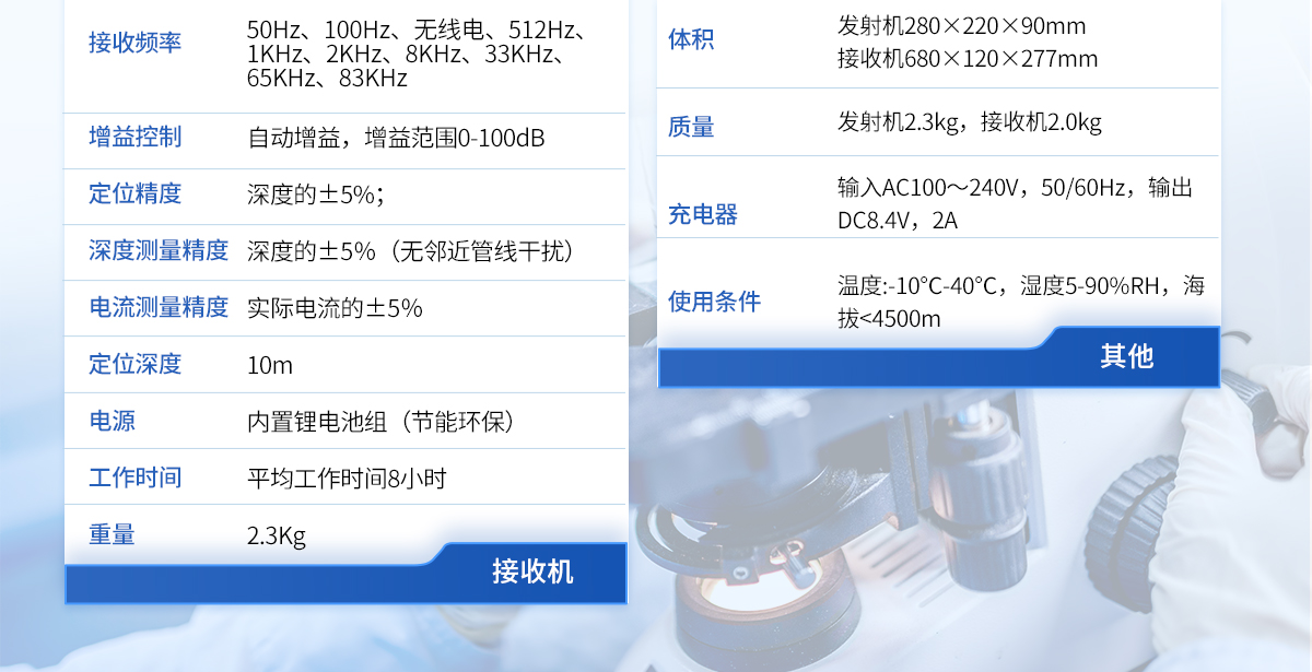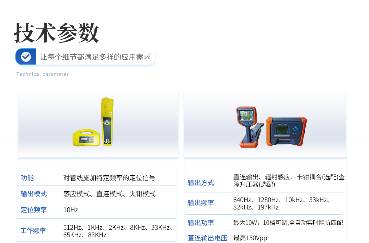 | 1、采用DSP處理器,運(yùn)算速度快,精度更高; | 2、帶有導(dǎo)向功能指標(biāo)管線走向,定位更快; | 3、采用10W寬頻發(fā)射機(jī),適應(yīng)各種環(huán)境的探測; | 4、接收機(jī)和發(fā)射機(jī)都采用鋰電池組供電,節(jié)能環(huán)保,每年可節(jié)省3000-5000元的電池費(fèi)用。 |