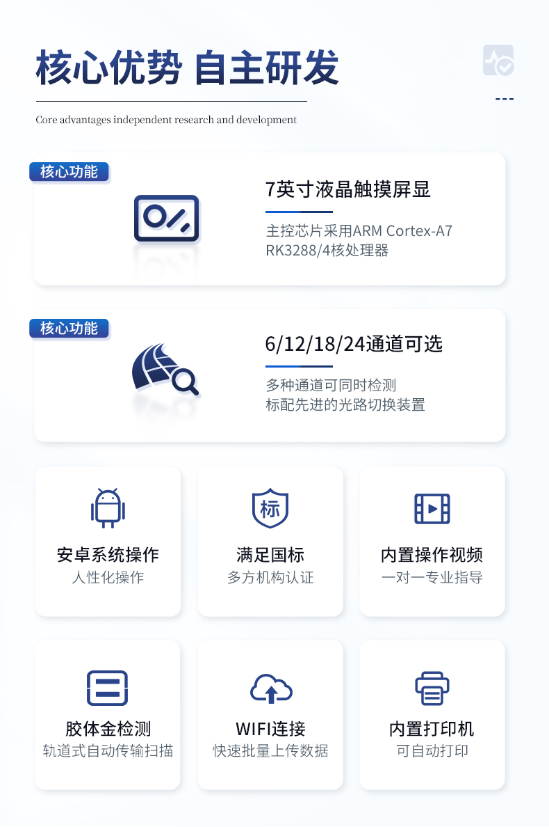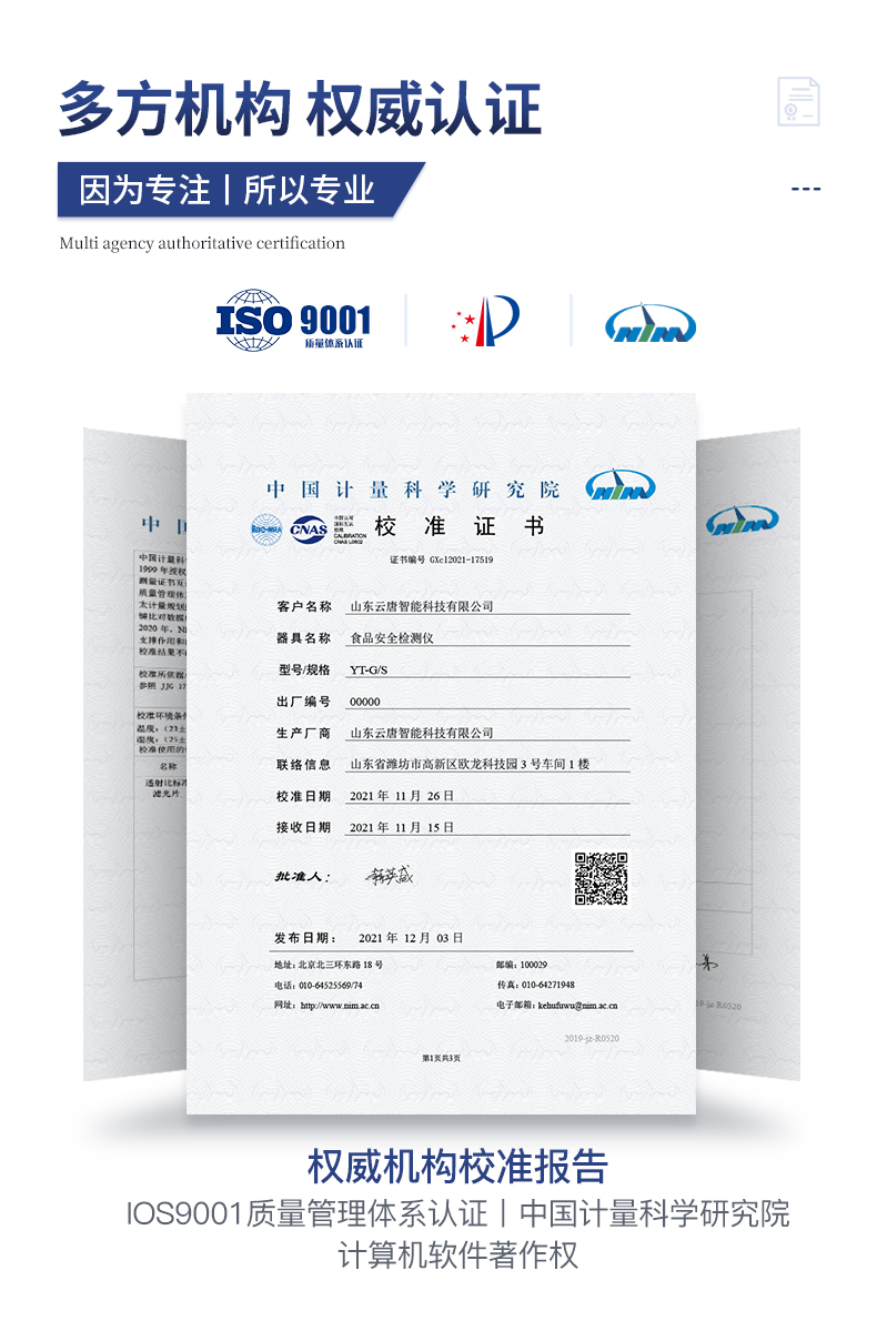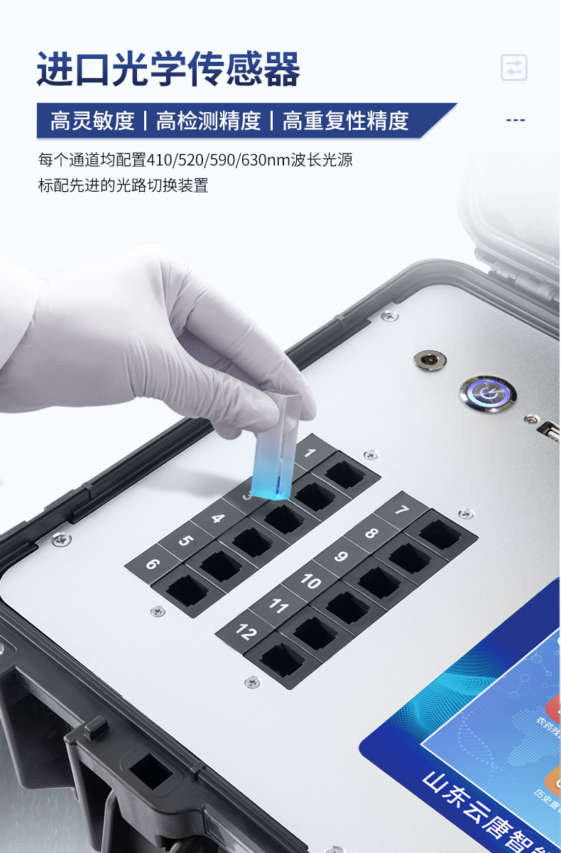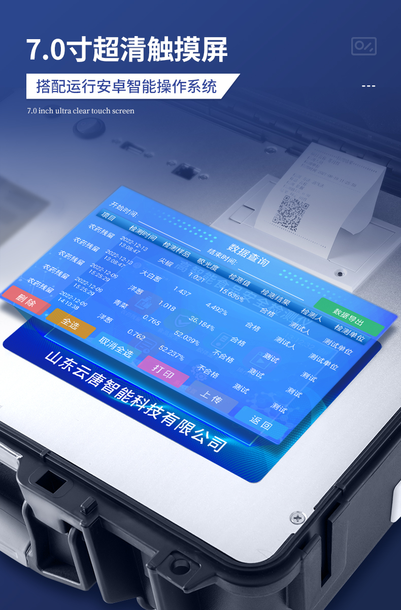 | 儀器采用手提式一體化系統檢測技術,將分光光度模塊、膠體金檢測模塊、新型農殘檢測模塊、數字化管理模塊、無線通訊模塊高度集成于一體,支持檢測200種食品安全檢測項目,同時預留升級檢測方法。 | 儀器檢測模塊標準化、智能化,檢測項目可隨意自由組合。檢測箱體內置多個標準檢測單元,檢測模塊可以調整配置。 | 顯示屏幕:儀器采用10.1英寸豎向液晶觸摸屏顯,搭配運行安卓智能操作系統,主控芯片采用ARM Cortex-A7,RK3288/4核處理器,主頻1.88Ghz,操作方便,性能更強。 | 檢測通道:≥12通道;采用精密旋轉比色池設計,使用同芯片同光源校準精度,解決不同光源之間的誤差值,更加準確**。(1-12通道間誤差0.1%,***:**202022821055.2) | 儀器光源:高精度進口四波長冷光源,每個通道均配置 410、520、590、630nm 波長光源,標配**的光路切換裝置,專利光路切換功能可實現64波長,并且所有檢測項目可實現所有通道同時檢測。 | 設備可一鍵校準,自動保存校準數據,自動對比校驗,得到精準光源,采用Android SP存儲數據,光源數據永不丟失,方便每一次使用。 | 通訊接口:配備無線通信模塊、4G(APN)通訊模塊、藍牙傳輸,同時具有雙USB接口以及RJ45網線接口,可以多方式實現數據保存及數據傳輸 | 存儲方式:支持U盤存儲,標準USB接口,免驅動安裝。檢測結果存儲容量20萬條以上,可生成Excel表格進行拷貝,并具有登錄保護功能。 | 智能化操作系統: | 1)操作系統:儀器可在同一檢測界面自動對應相關檢測通道,一次性選擇1-12個樣品名稱,無需退出界面,節省操作時間。并可以對每個通道屬性和樣品信息單獨進行編輯,例如送檢單位、人員,檢測人員等,打印時勾選打印顯示。 | 2)數據集成系統:設備首頁自動匯總分析檢測數據,包含:周檢測數據、月檢測數據,全部檢測總數量,均包含檢測總數,合格數,不合格數,以及相關柱形分析圖,各項檢測數據一目了然,無需電腦查詢,更加快捷直觀。 | 3)數據庫系統:十幾項數據庫分類管理儀器:包含項目類型、項目數據、檢測數據、歷史記錄、國標信息、曲線信息、采樣信息、檢測信息、受檢信息、復核信息、圖表信息、光源校準信息、打印樣式信息、樣品庫信息等等,數據庫之間互相協調聯動保證數據的真實完整性。同時產品數據庫以及歷史檢測記錄支持一鍵檢索功能。 | 4)限量規判系統:具有限量查詢、添加物質合規判定系統。檢測出結果后,系統自動調用系統數據庫中相關國標進行比對判定,客觀顯示判定結果是否合格。 | 5)項目預設系統:儀器具有任務預設模塊,一鍵提前預設,給出方便快捷的新檢測方案,每一個任務分別可以設置不同的樣品、批次、編號、來源、備注、抽樣信息、檢測信息、受檢信息、復核信息等更多信息。樣品送檢時一鍵調取保存信息,并可多次調取,大大提高檢測效率。 | 6)數據監管系統:同步對接監管平臺,數據可局域網和互聯網數據上傳,檢測結果可選擇直接傳至食品安全監管平臺。進行區域食品安全監管及大數據分析處理與數據統計,檢測區域食品安全長短期動態,達到食品安全問題預估、預警。 | 7)打印系統:內置全新打印機,新創自定義打印方式,可按需靈活勾選控制:產品合格證(國家農業部標準要求),二維碼,抽樣信息、檢測信息,受檢信息、復核信息、抽樣日期、檢測日期等信息的打印。 | 供電模式:儀器交直流兩用,直流12V供電,可連接車載電源,可配6ah大容量充電鋰電池,電量可實時顯示,方便戶外流動測試。 | 膠體金檢測模塊:采用雙通道CMOS成像處理技術及膠體金免疫層析技術,可同時讀取雙膠體金卡數據,自動采集、處理分析,將檢測結果顯示,并可根據參考限值自動判斷檢測結果,可檢測常見的獸藥殘留、生物毒素、抗生素、違禁添加物等。 | 1)探測技術:CMOS成像探測; | 2)檢測通道:1個通道; | 3)檢測方式:消線法和比色法; | 4)顯示模式:陰性或陽性; | 5)曲線形式:軌道式掃描方式,顯示金標卡圖像,實時生成、識別CT曲線圖,無需手動調整,完成檢測后自動退出檢測卡。兼容市場上其他金標卡,使用耗材不受限制。 | 儀器加入遠程升級功能,可定向分客戶分儀器更新,開機后自動更新,客戶無需任何操作,即可升級全新項目。做到了無需退換機器即可實現實時遠程升級檢測儀器。 |