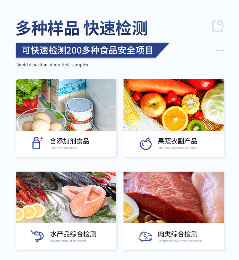| 病害肉診斷:組胺、揮發性鹽基氮、肉制品酸價、水發產品中組胺 | 瘦肉精激素類(獸藥):鹽酸克倫特羅、沙丁胺醇、萊克多巴胺、己烯雌酚、喹乙醇等 | 抗生素殘留類(獸藥):四環素類、硝基呋喃類、磺胺類、沙星類、喹諾酮類、慶大霉素、鏈霉素、阿莫西林、紅霉素等 | 水產品安全類:孔雀石綠、氯霉素、呋喃妥因代謝、呋喃西林代謝、呋喃它酮代謝、呋喃唑酮代謝 |
