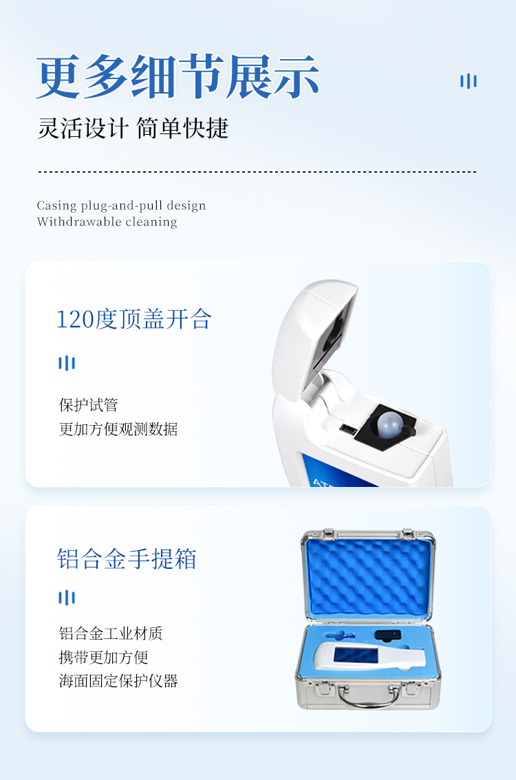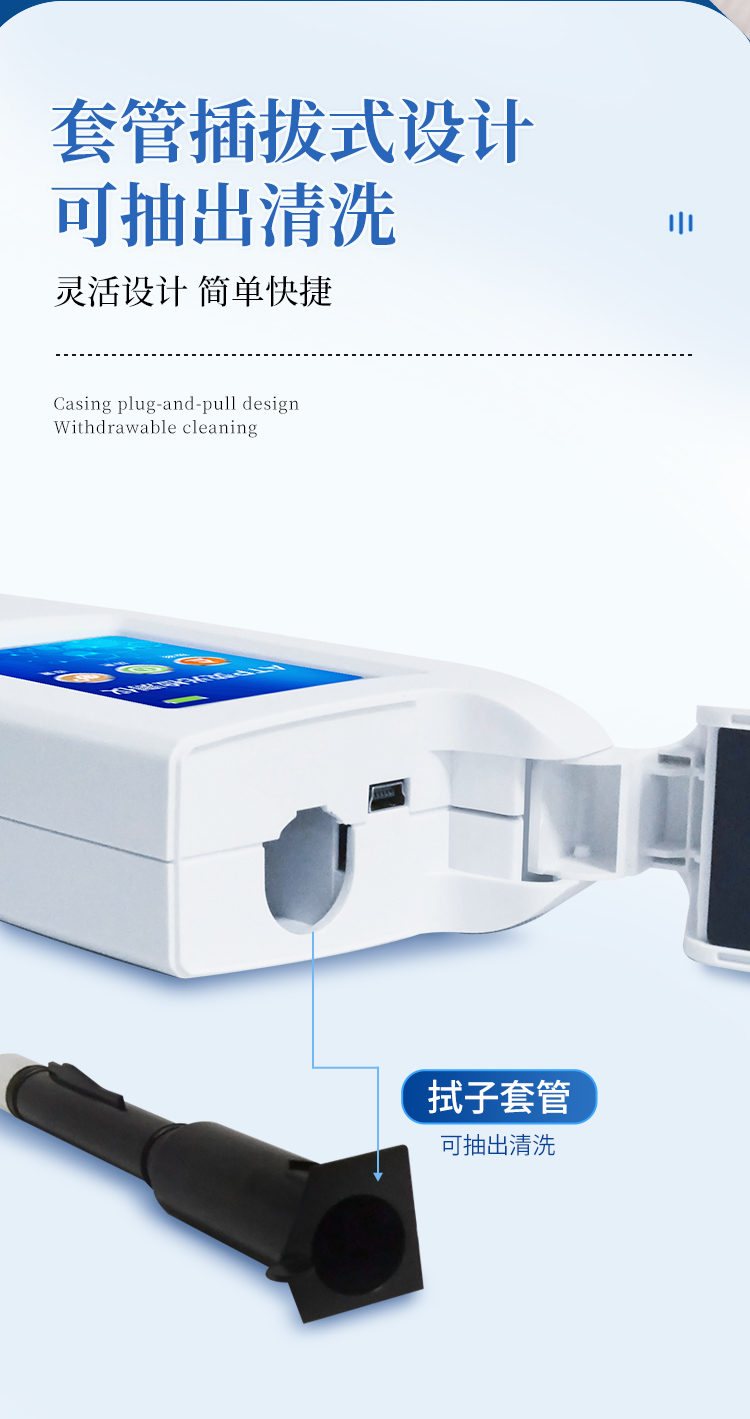 | 實用性 —— 可根據環境檢測需求設定上下限值,做到數據快速評估預警,表面潔凈度快速篩查。 | 靈敏度高 —— *************** | 速度快 —— 常規培養法18-24h以上,而ATP只需要十幾秒鐘 . | 可行性 —— 微生物數量與微生物體內所含ATP有明確的相關性。 通過檢測ATP含量,可間接得出反應中微生物數量 | 可操作性 —— 傳統培養方法需要在實驗室由經過培訓的技術人員進行操作;而ATP快速潔凈度檢測操作非常簡便,只需簡單的培訓即可由一般工作人員進行現場操作。 | 體驗更好 —— 試子套管采用插拔式靈活設計,可定期清洗長期使用,延長儀器壽命。 |