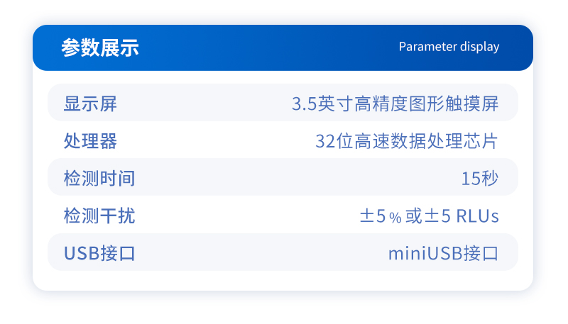 | 顯示屏:3.5英寸高精度圖形觸摸屏 | 處理器:32位高速數據處理芯片 | 檢測精度:********** | 大腸菌群:******** | 檢測范圍:*************** | 檢測時間:15秒 | 檢測干擾:±5﹪或±5 RLUs | 操作溫度范圍:5℃到40℃ | 操作濕度范圍:20—85﹪ | ATP回收率:90-110% | 檢出模式:RLU、大腸菌群篩查 | 50個用戶ID 設定 | 可設定的結果限值個數:251個 | 自動判斷合格與不合格 | 自動統計合格率 | 內置自校光源 | 開機30秒自檢 | 配有miniUSB接口,可將結果上傳至PC | 配備專用軟件驅動U盤代替傳統光盤 | 儀器尺寸(W×H×D):188 mm×77mm×37mm | 使用可充電鋰電池免電池更換 | 備用狀態(20℃):6個月 | 中文操作手冊 | 穩定的液體熒光素酶 | 潤濕的一體化采集拭子 |